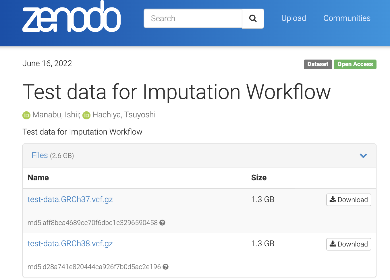 🔗Test data for Imputation Workflowにアクセスします。以下の2つのファイルがおいてあります。