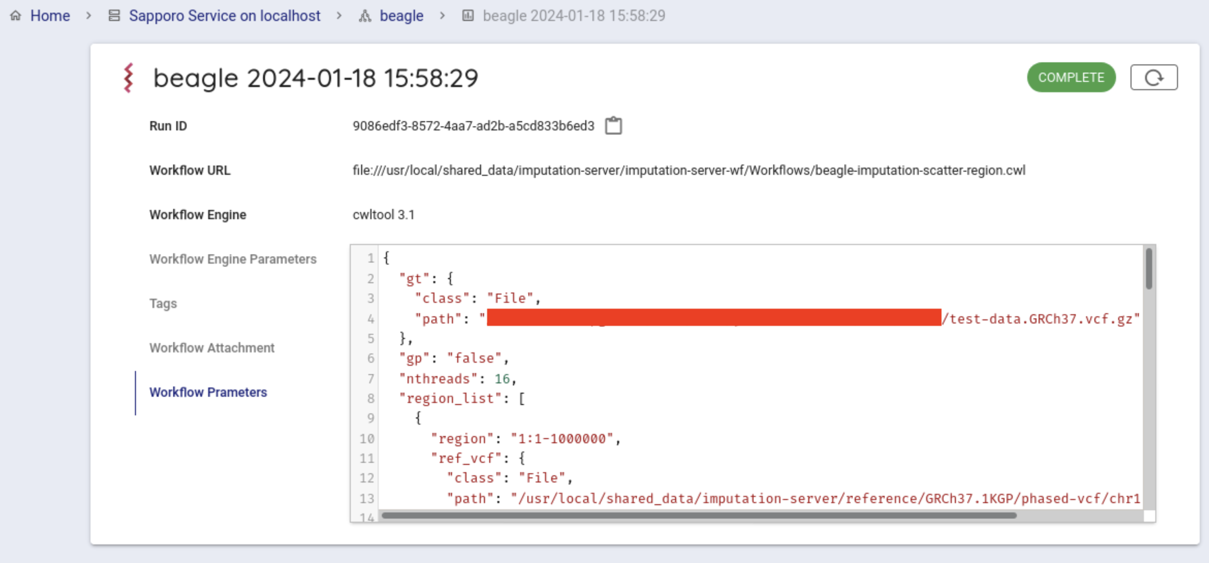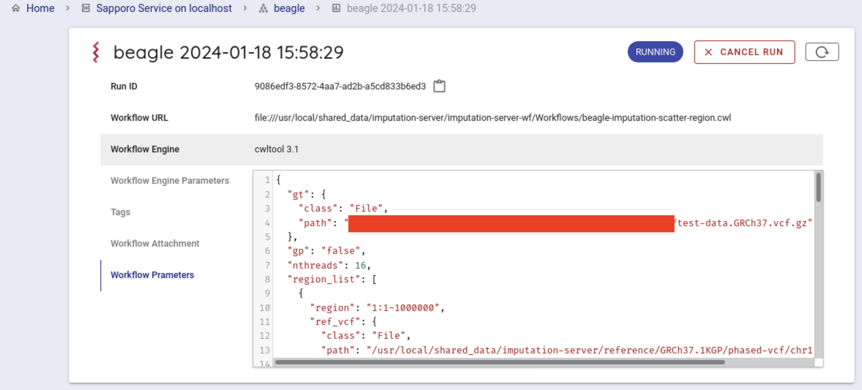 Workflow Parameters に先程、 imputationserver-web-uio で生成したパラメータを入力します。