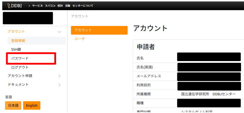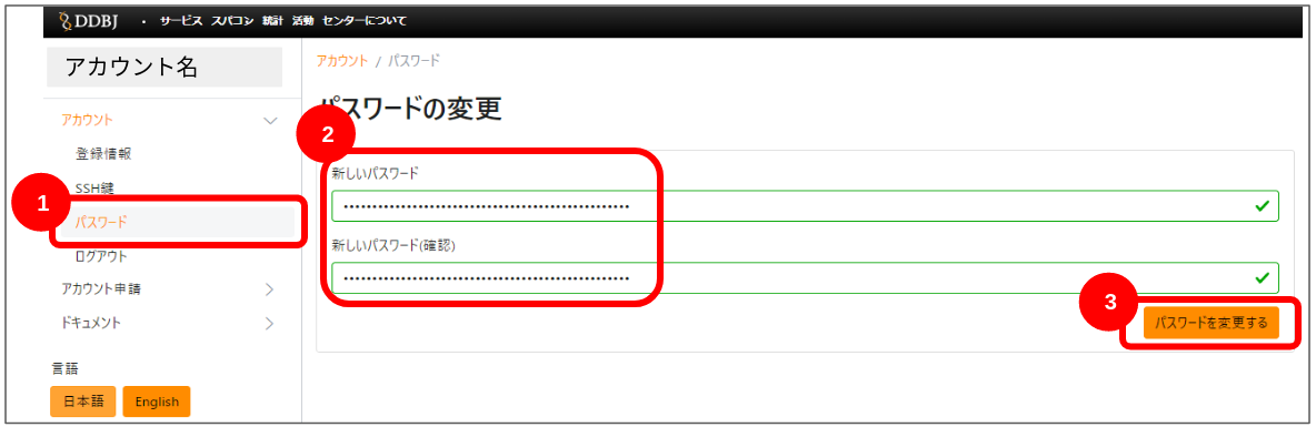「パスワード」をクリックすると、以下の画面になります。 新しいパスワードを入力し、「パスワードを変更する」をクリックします。